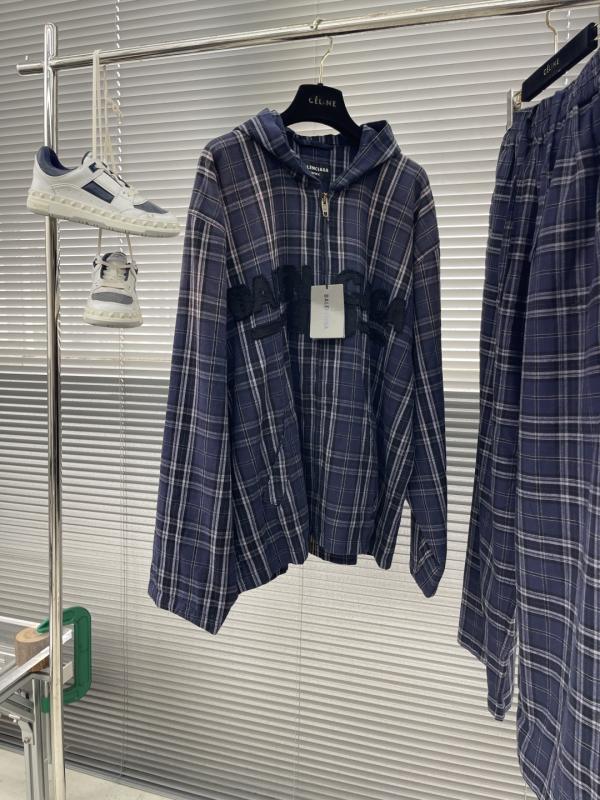 Balenciaga 25ss 新款连帽拉链夹克 这款 Balenciaga 25ss 新款连帽拉链夹克采用海军蓝和灰色格纹法兰绒面料,是市场上的高版本。款式经典,适合搭配长裤或上衣。 尺码信息 (S.M.L): 尺码 衣长 (cm) 胸围 (cm) 肩宽 (cm) S 71 126 58 M 72 134 59 L 73 – 60 (注:部分胸围数据缺失,以实际收到为准) 细节展示: