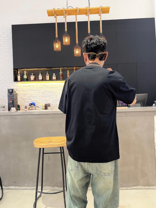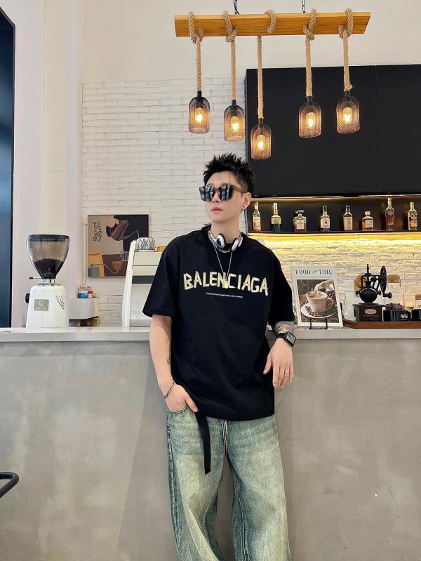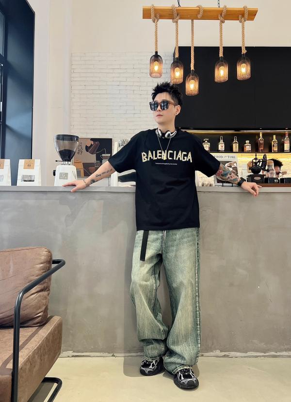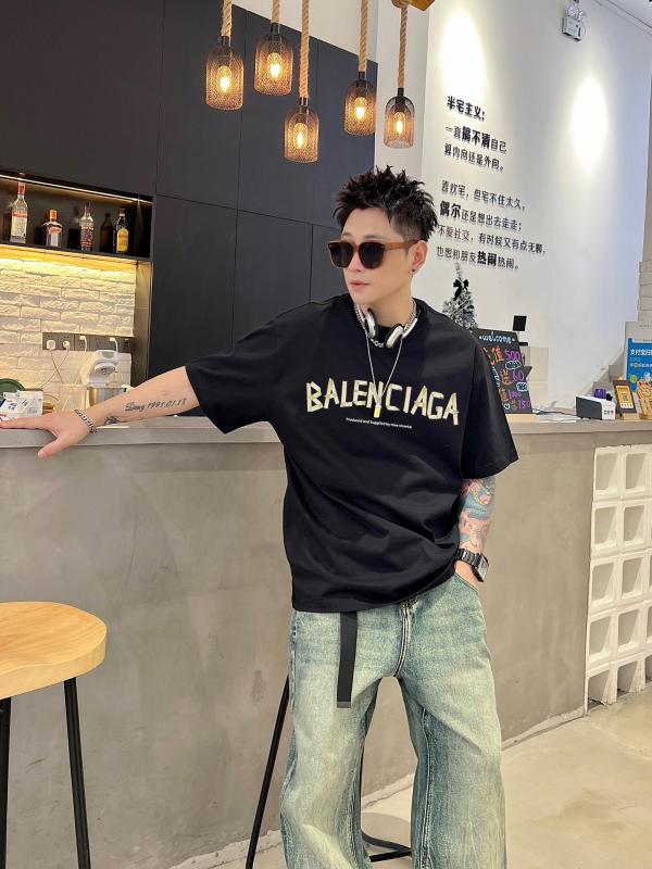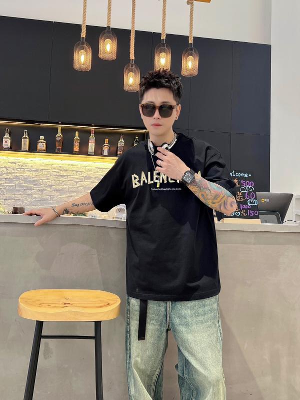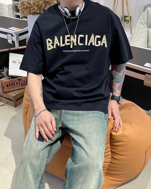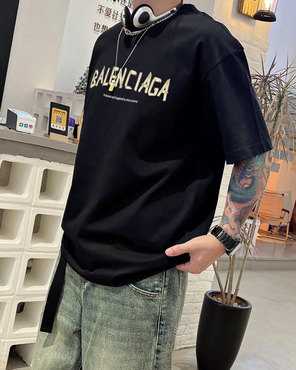 这款 Balenciaga 新型字母印花双层重工短袖 T 恤,前幅大面积印花采用大康丽数码印花机直喷,成本极高。经过多次的调试打版,图案色差还原度与原版接近百分之九十九,区别于市场上的普通胶印版本,制作超级费工时。