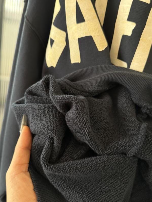 卫衣在印花成衣后,经历了多道复杂的做旧工艺,以打造其独特的复古和磨损效果: